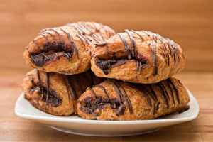 ($3.50- in house baked croissant filled with melted swiss chocolate & topped with chocolate chips and drizzled hardened chocolate)