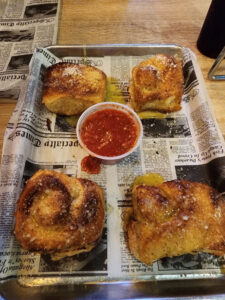 The Skinny- the joint opened about 3 months ago, table/hi-top/counter seating, menu of reasonably priced- pizzas/salads/calzones/wings/subs/garlic rolls/beers/wines, open Monday-Thursday 11am–10pm/ Friday–Saturday 11am-11pm/ Sunday noon–10pm.