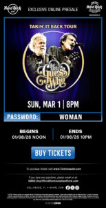 JUST ANNOUNCED — The Guess Who are bringing the Takin’ It Back Tour to Hard Rock Live in Hollywood, FL, on March 1st, 2026. See Randy Bachman and Burton Cummings back on stage together for a night you won’t want to miss. Tickets go on sale January 9th, 2026 at 10AM local time.
